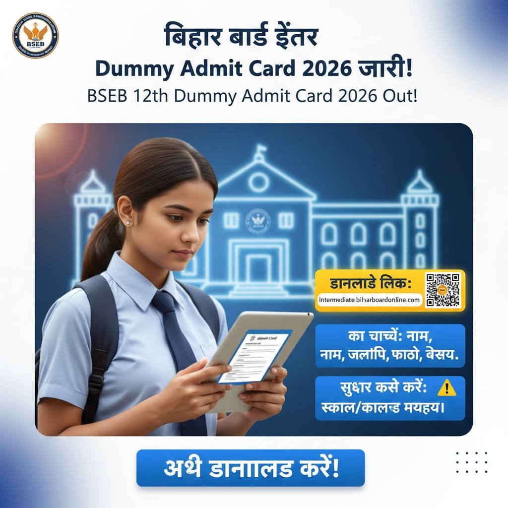 Bihar School Examination Board (BSEB) ने 2026 के इंटरमीडिएट (Class 12) वार्षिक परीक्षा के लिए Dummy Admit Card जारी कर दिया है। यह Dummy Admit Card परीक्षा से पहले छात्रों की जानकारियों को सही ढंग से जांचने और सुधारने के लिए अत्यंत आवश्यक है। अगर आप 2026 में बिहार बोर्ड इंटर परीक्षा देने वाले हैं, तो अपना Dummy Admit Card यहाँ से डाउनलोड करें।