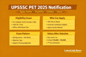 उत्तर प्रदेश में सरकारी नौकरी की तैयारी करने वाले candidates के लिए UPSSSC Preliminary Eligibility Test (PET) 2025 अब सिर्फ एक exam नहीं, बल्कि sarkari bharti system ka entry gate बन चुका है। उत्तर प्रदेश अधीनस्थ सेवा चयन आयोग (UPSSSC) ने PET को सभी आने वाली Group-C और कुछ Group-B recruitments के लिए अनिवार्य कर दिया है। इसका मतलब साफ है—चाहे आप Lekhpal, Junior Assistant, Clerk, Forest Guard या किसी भी UPSSSC post का सपना देख रहे हों, PET qualify किए बिना आगे बढ़ना possible नहीं है।